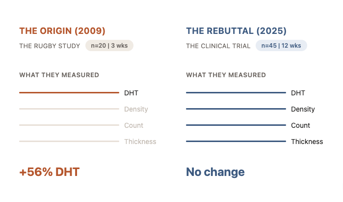 What they found: DHT barely changed, while hair density, follicle count, and thickness stayed flat.