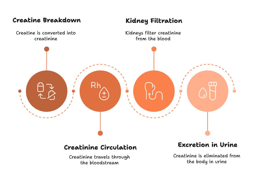 Filtration: Creatinine circulates in the blood and your kidneys filter it into urine.