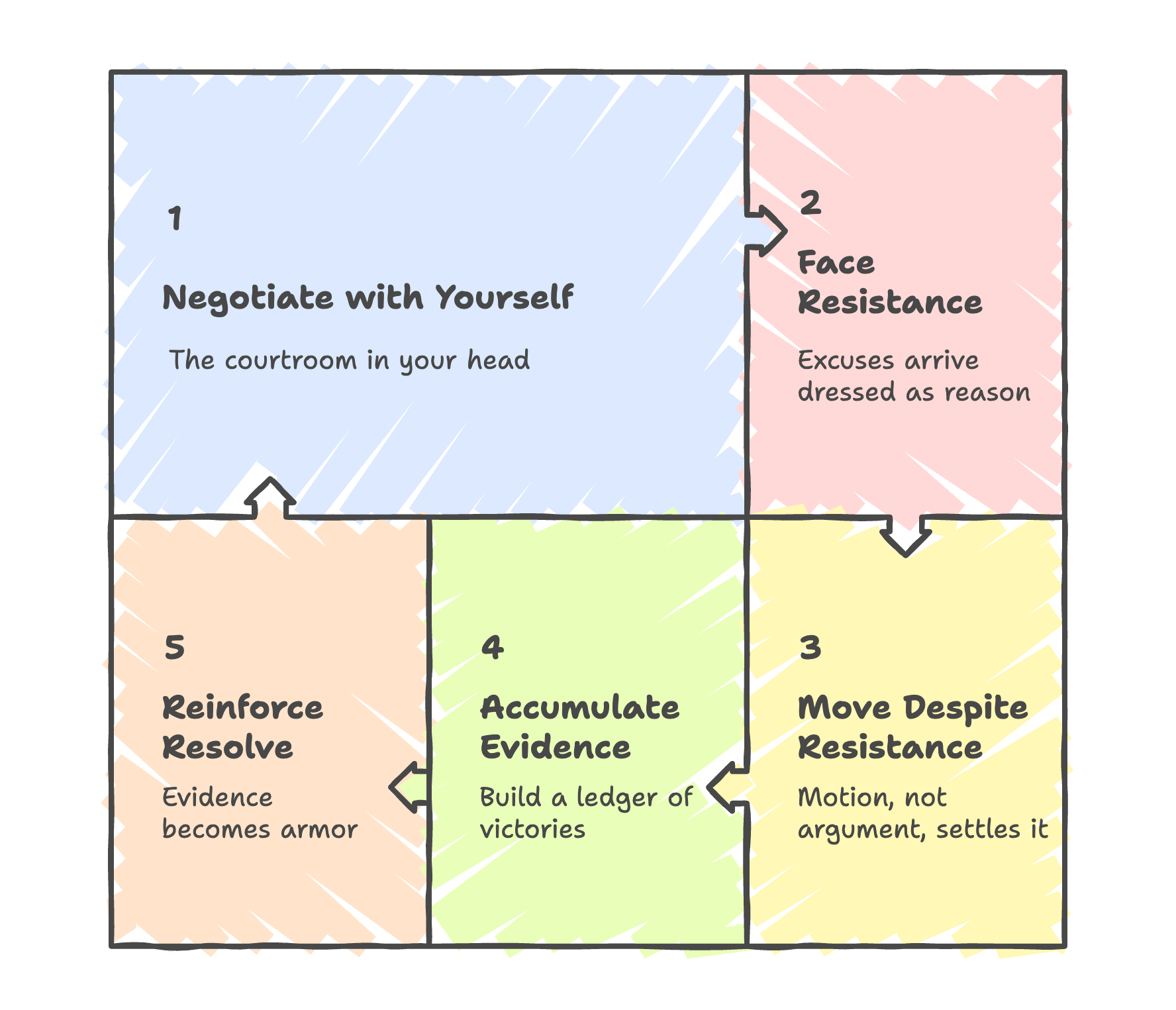 What changed is my personal ledger of evidence against it: hundreds of battles won, hundreds of times the voice said ‘skip today’ and I went ahead anyway. Not because it felt good. It rarely does. But because I’ve proven, repeatedly, that the resistance doesn't get to win.