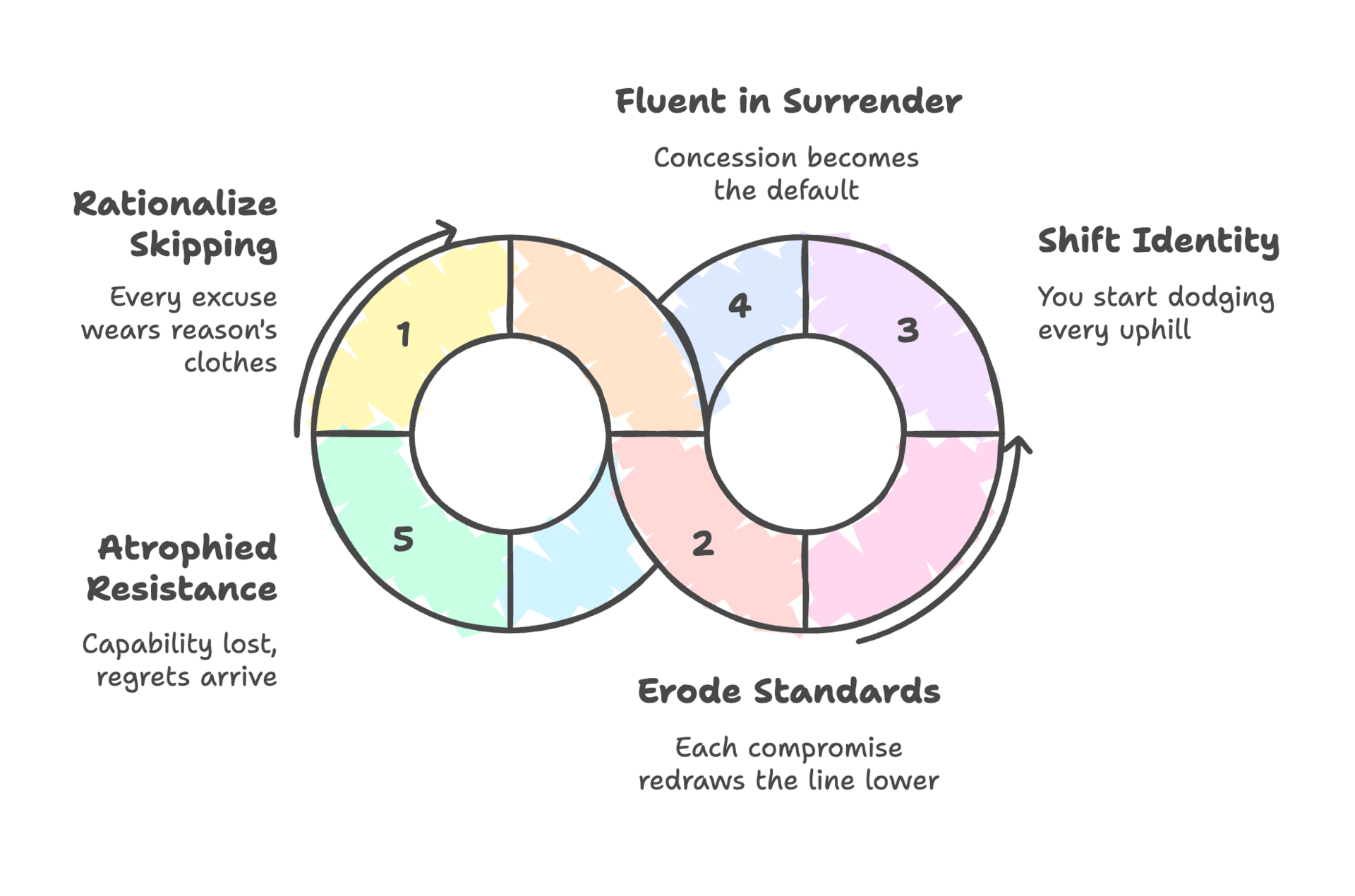 First comes rationalizing the occasional skip; then mastering the art of finding 'good reasons.' Your standards erode so gradually, like a shoreline losing grain by grain, until you become fluent in the language of surrender with no memory of ever learning it.